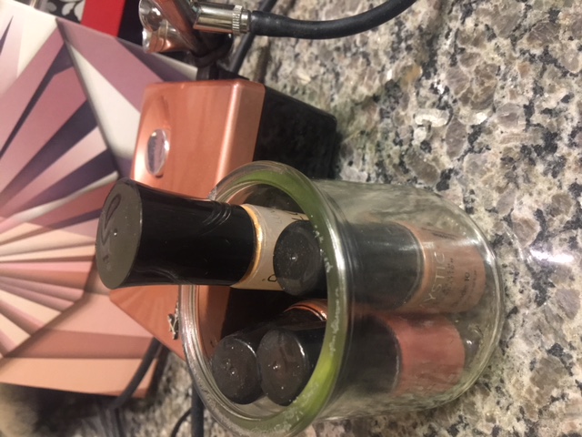 Using a Oui jar for Luminess foundation May 29, 2018 | empty Oui yogurt container to hold Luminess foundation on the countertop, with Legend airbrush system in background